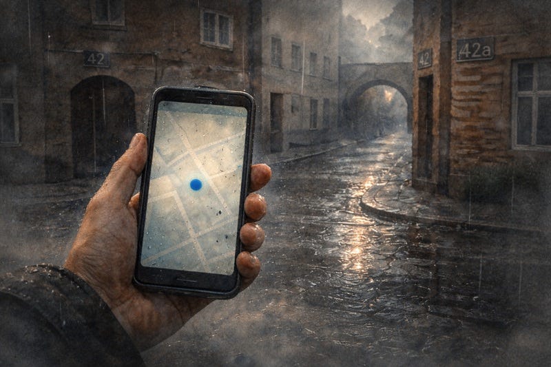 Die Stimme aus dem Handy klingt so sicher. Der blaue Punkt steht still. Er schaut auf Haus Nummer 42 und ihm schwant: Hier fängt die Suche erst an.